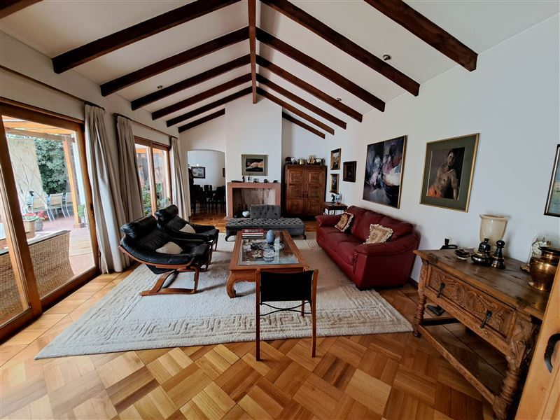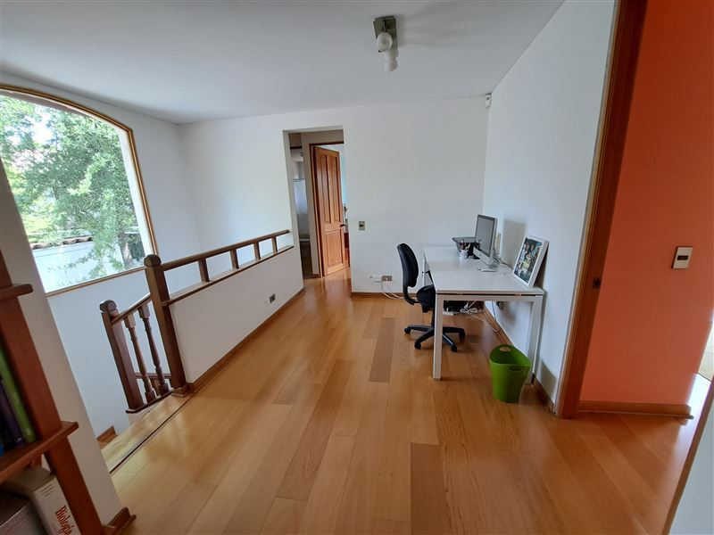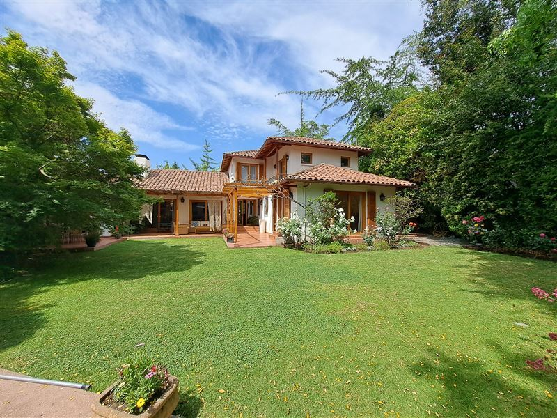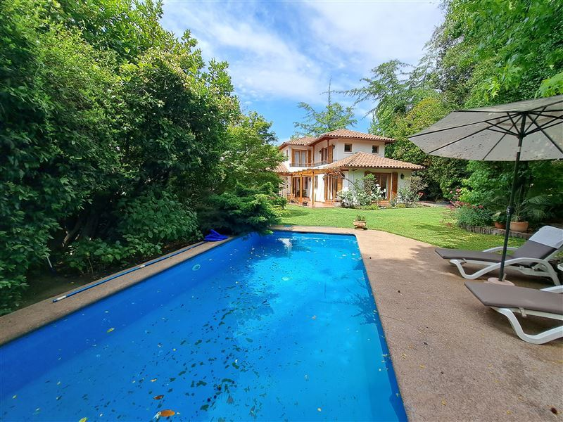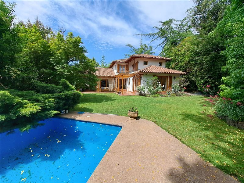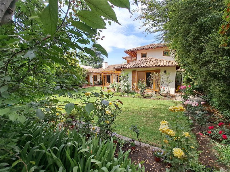Maravillosa casa estilo colonial con un lindo jardín y muchas zonas diferentes de descanso en Los Dominicos, calle de gran plusvalía y seguridad.1er piso: Hall de entrada amplio con linda vista al jardín, grandes recibos separados con salida a terrazas y al jardín, cocina amoblada y equipada con comedor de diario separado, servicios y lavadero, 1 salas de estar , escritorio o 5 to dormitorio), 2 baños (1 vista), dormitorio principal en suite con w.closet y vista al jardín y terraza.2do piso: estar, 3 dormitorios ( 1 con balcón) , 2 baños.Exteriores: piscina, terrazas, sector quincho muy acogedor y entretenido, 4 estacionamientos techados, patio de servicios amplio, bodegas,Interior: pisos de madera y parquet, mármol entrada