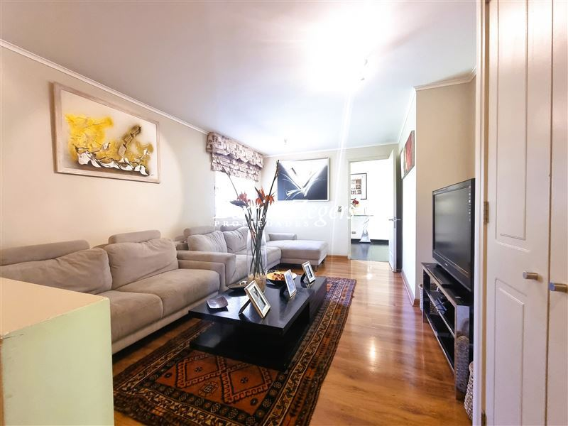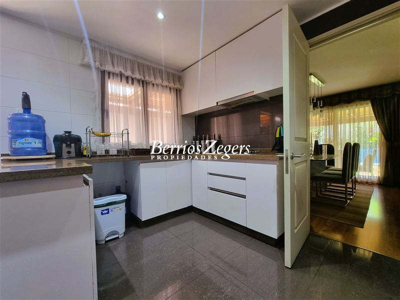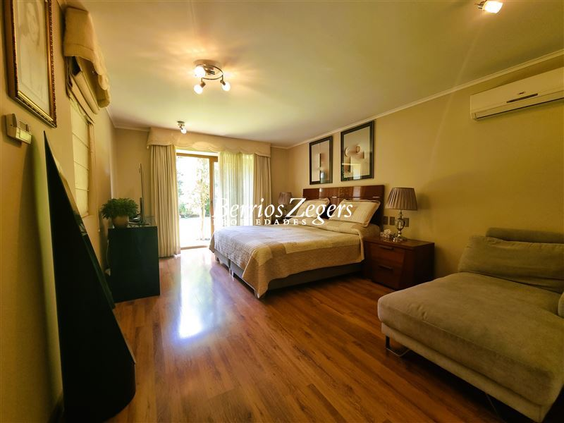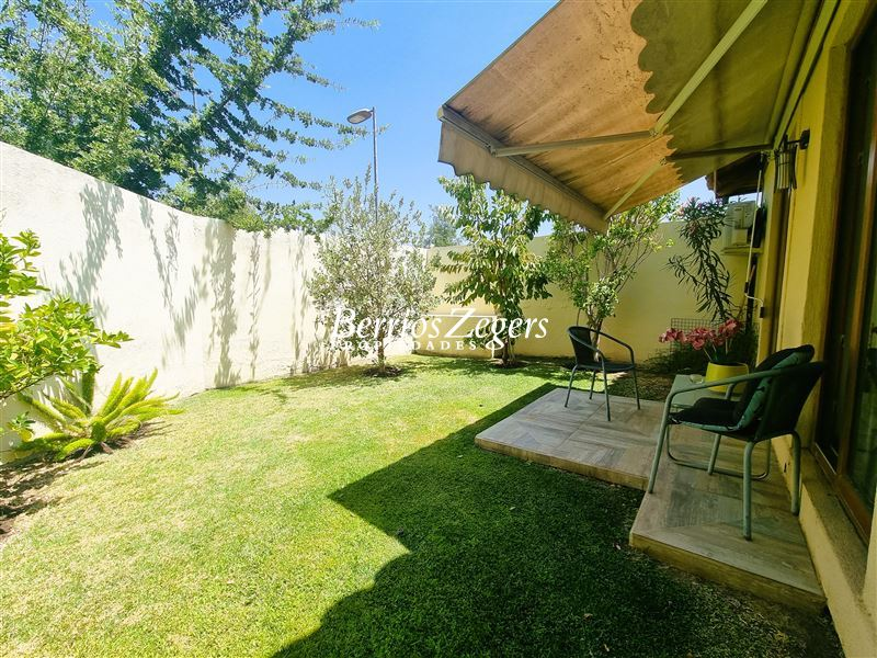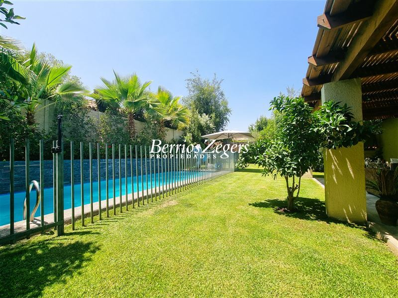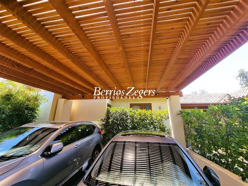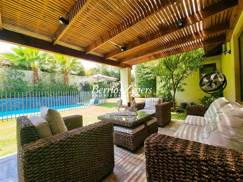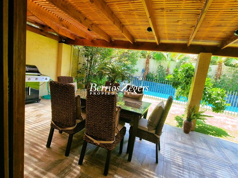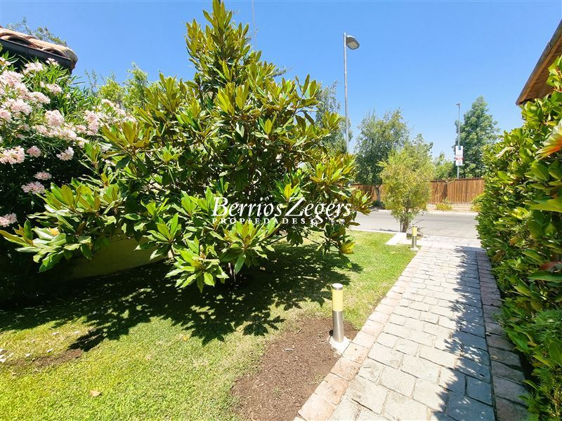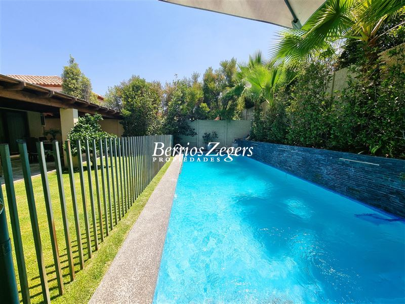 170/560 mts. aprox. Linda y cómoda casa chilena, de un piso, en condominio con máxima seguridad 24/7, consta de hall de entrada, living comedor separados con salida a gran terraza techada, Impecable cocina con mesones de granito, comedor de diario, con salida a logia techada, baño de visitas y servicios completos, dormitorio principal en suite con salida al jardín, baño con luz natural y 2 walk in closet separados, mas dos dormitorios que comparten un baño, gran sala de estar, lindos jardines formados, con riego automático, gran piscina con paneles solares, estacionamiento para dos autos techados, y estacionamientos descubiertos para 3 autos más. La propiedad cuenta con ventanas termopanel, calefacción central por radiadores, y aires acondicionados.Condominio cuenta además con entrada controlada, estacionamientos de visita, plazas, areas verdes con juegos infantiles, cancha de futbol, cámaras de circuito cerrado por todo el condominio