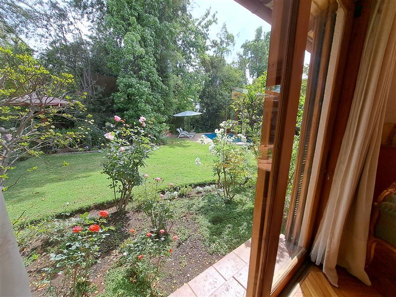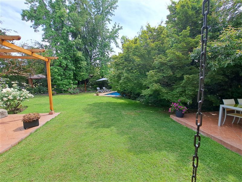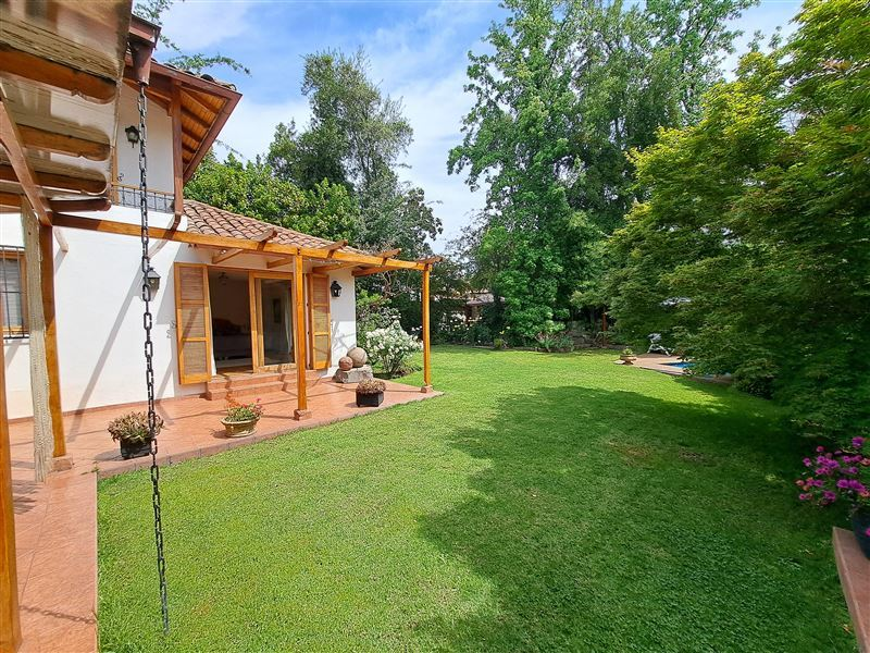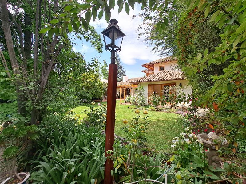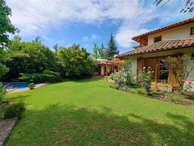 Maravillosa casa estilo colonial con un lindo jardín y muchas zonas diferentes de descanso en Los Dominicos, calle de gran plusvalía y seguridad.1er piso: Hall de entrada amplio con linda vista al jardín, grandes recibos separados con salida a terrazas y al jardín, cocina amoblada y equipada con comedor de diario separado, servicios y lavadero, 1 salas de estar , escritorio o 5 to dormitorio), 2 baños (1 vista), dormitorio principal en suite con w.closet y vista al jardín y terraza.2do piso: estar, 3 dormitorios ( 1 con balcón) , 2 baños.Exteriores: piscina, terrazas, sector quincho muy acogedor y entretenido, 4 estacionamientos techados, patio de servicios amplio, bodegas,Interior: pisos de madera y parquet, mármol entrada