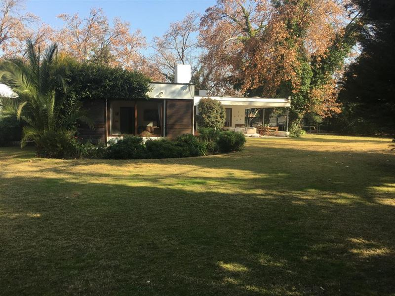 400/2879m2 aproximados. Hermosa casa estilo mediterráneo de 1 piso.Consta de 5 dormitorios y 4 baños mas servicios completos. Amplio hall de entrada con piedra Pelequen , baño de visitas, gran living-comedor separados con hermosa vista a patio y con salida a amplias terrazas, piscina y maravilloso paisaje con grandes arboles.Escritorio o segunda sala de estar (paredes cubiertas con madera) con salida a terraza.Cocina totalmente equipada con comedor de diario con salida a patio de servicio techado con bodega, amplia logia y dormitorio de servicio.Sector dormitorios, separados de áreas comunes, piso de madera. Sala de estar. Dormitorio principal en suite con w-closet. mas 2 dormitorios que comparten un baño, mas 2 dormitorios en suite. Ventanas termopanel, 2 calefont y caldera ( para conectar calefacción), riego automático, alarma, tiene un depto externo de un ambiente y baño.Cuenta con muchos estacionamientos.Excelente ubicacion.