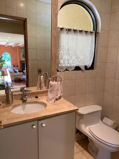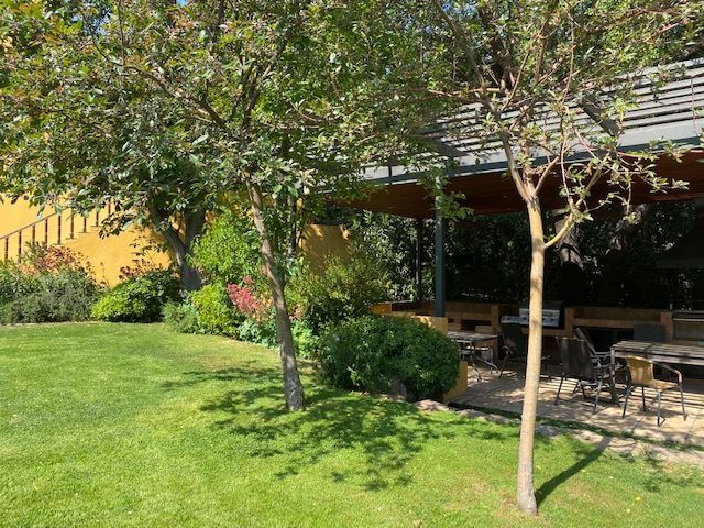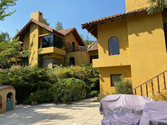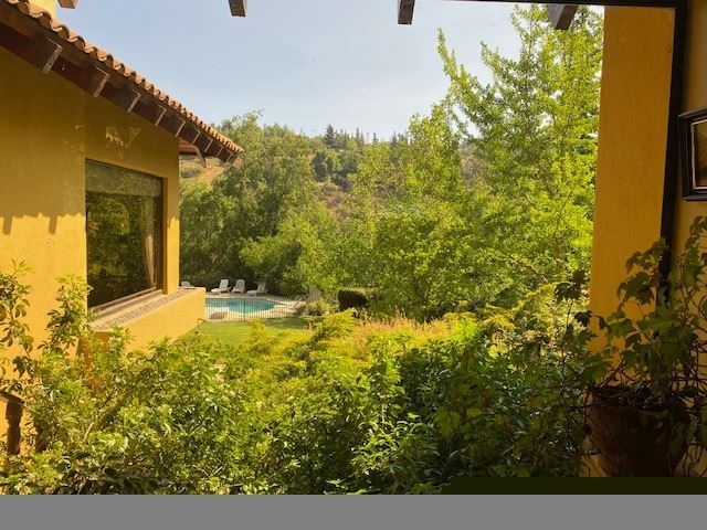 Linda Casa estilo Chilena 500 mt2 construidos y 6000 mt2 de terreno aprox casa en condominio con arboles nativos ;hall de entrada con vista al jardín living y comedor separados con salida a terraza , Cocina amoblada y equipada con isla , pieza y baño de servicio , 5 dormitorios , 5 baños , 3 dormitorios en suite , sala de estar , escritorio , sala de juego en subterráneo, dormitorio principal en suite con salida a terraza , piscina, quincho, 10 estacionamientos acceso controlado 24/7 por guardias , gastos comunes comunes $400.000 incluye agua , y luz ,transporte personal .