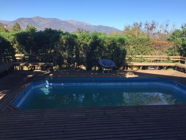 240/1650 m2 gran casa en Olmué, cerca plaza y lugares típicos, rodeada del cerro la campana, lugar tranquilo, tiene diversos árboles de paltos, naranjos, mandarinas, un parrón de uva, un guindo. Consta de 5 dormitorios, 3 baños, (dormitorio principal en suite), 2 boscas combustión a leña, living comedor separado, cocina americana, piscina, bodega, pieza de servicio independiente, pozo más dos estanques para almacenar agua, estacionamiento para 3 autos.