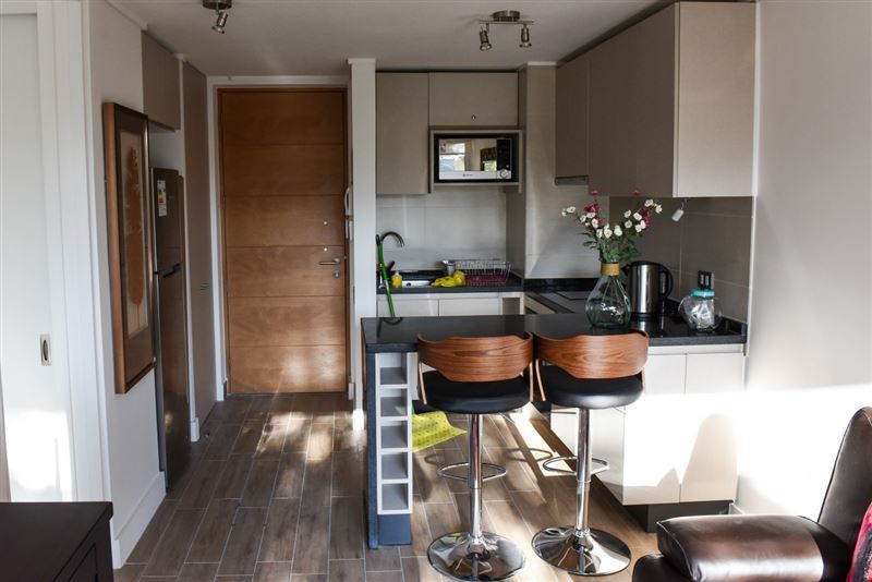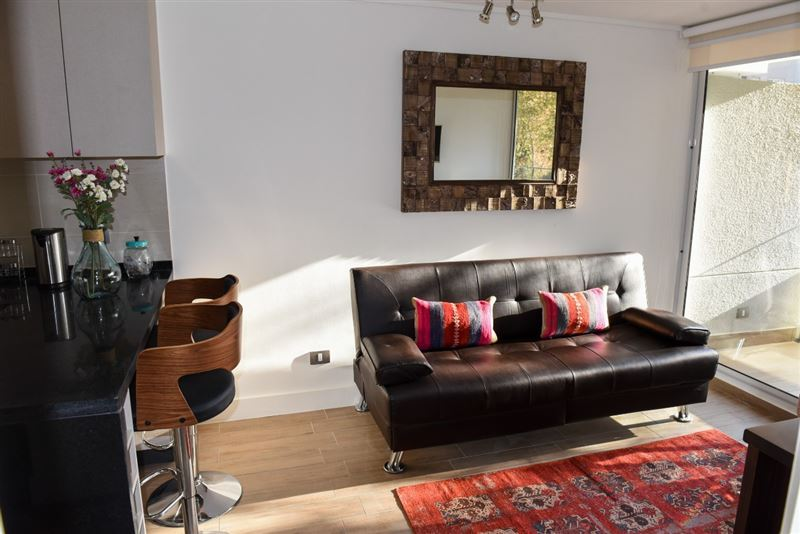 Amoblado, recibo, cocina americana, dormitorio en suite, estacionamiento
