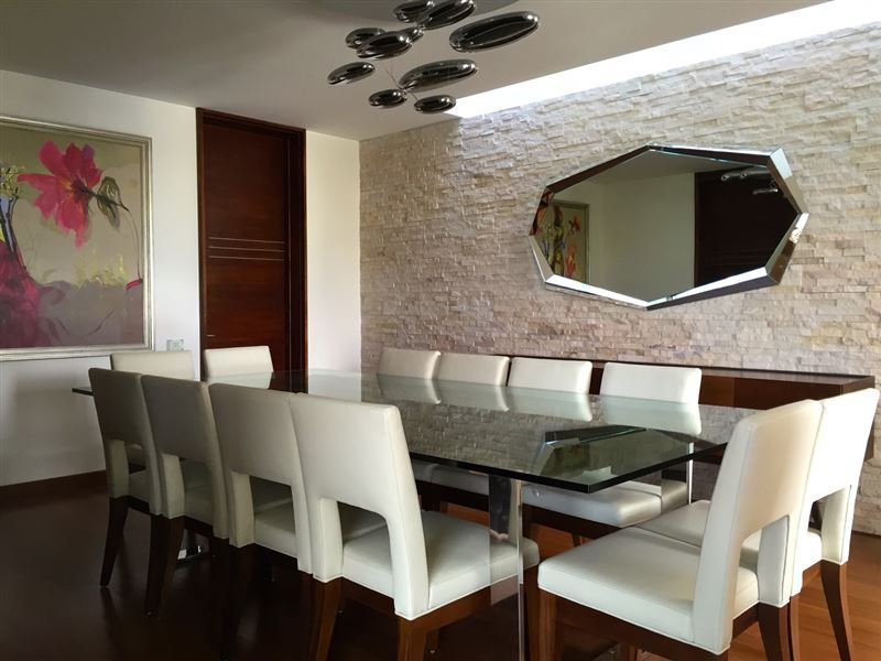Metraje utiles 402 metros2 mas 356 metros2 de terrazaHALL: Con triple altura de más de 10m.SUITE PRINCIPAL: 1 (con dos W.Closet, baño con hidromasajes, ducha y wc separado).SUITES ADICIONALES: 3.SUITE MULTIUSO CON SAUNA: 1 (puede utilizarse como suite adicional, escritorio, sala familiar, gimnasio etc…).LIVING: 1 Con una altura de 3.20m.COMEDOR: 1 Con lucarna y pared de piedra.SERVICIOS: 2 dormitorios de servicio con estar propio o zona de planchado, cuenta con loggia interior independiente y zona exterior para secar ropa.BAÑOS: 6COCINA: Completa, con isla, comedor de diario y acceso directo del estacionamiento o servicios.MIRADOR Y B.B.Q. : Tiene Quincho completo dentro del penthouse y con zona de terraza techada.PISCINA: Exclusiva dentro del penthouse de 5m x 7,5m aproximadamente y con borde sin fin.ASCENSOR: ascensor interno, propio del departamento.ESTACIONAMIENTOS: 4 (2 en subterráneo con ascensor de uso exclusivo y estacionamiento directo en su penthouse y 1 doble al exterior).BODEGA: 1